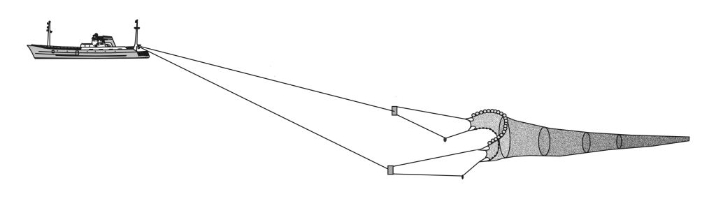 One especially harmful way to catch fish is Bottom Trawling. As shown in the image on the right side, a net is pulled over the seafloor to stir up fish and other targeted animals. It is disrupting the sediments and imprinting deep scars on muddy bottoms. These long-lasting destructions are a major risk for the health of the sea beds. That’s the reason why some countries started to ban bottom trawling.